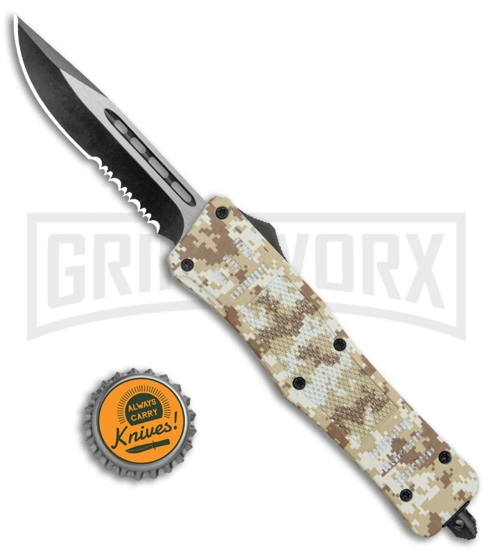 This Atomic Medium Tan Camo OTF Knife model has a two-tone satin finished drop point blade and a partially serrated edge. The Atomic OTF offers a rugged design with solid EDC construction. The handle provides a comfortable grip, and includes a pocket clip for carrying comfort. Using the side mounted slide button will activate the double-action automatic feature for lightning fast blade deployment. A pommel glass breaker finishes off the tactical design.