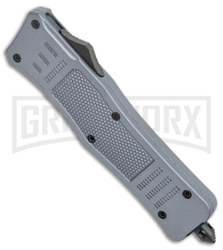 The Atomic Defender OTF Knife model has a gray handle and a two-tone clip point blade with a partially serrated edge. It features a rugged design with solid EDC construction. The handle is textured for improved grip with a pocket clip for tip-down carrying comfort. Using the side mounted slide button activates the double-action, automatic feature, for lightning fast blade deployment. A pommel glass breaker finishes off the tactical design. It also comes with a Velcro, nylon carrying case.
