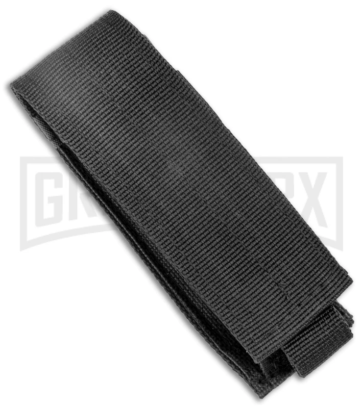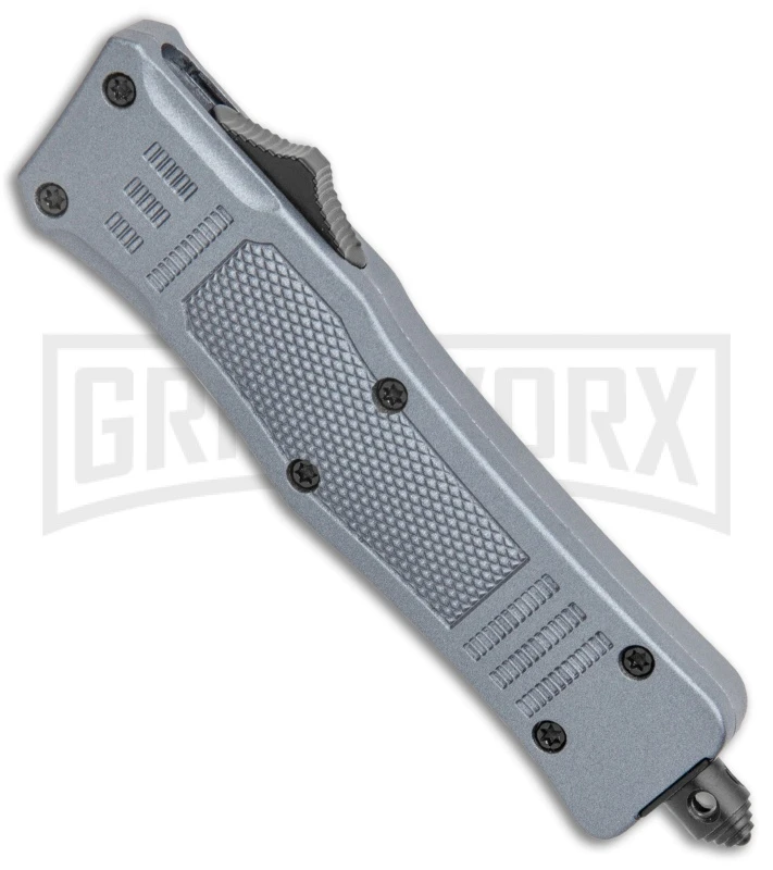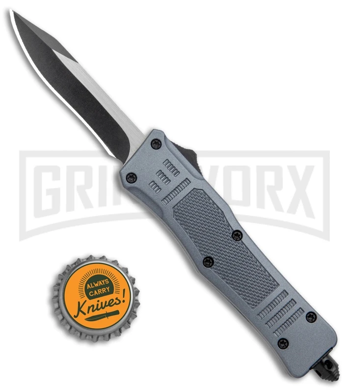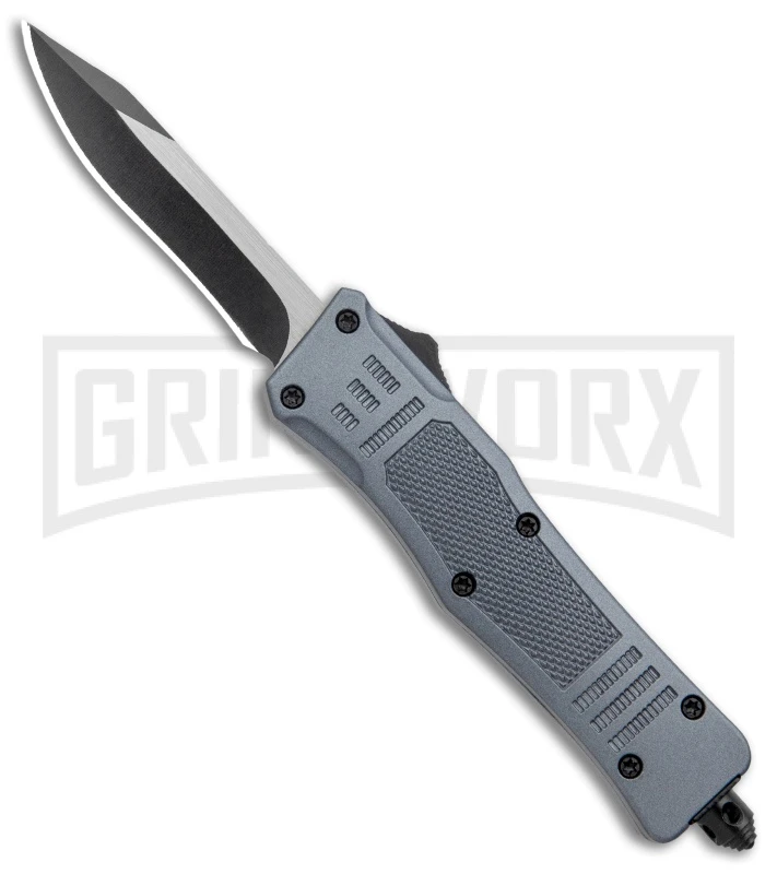 The Atomic Defender OTF Knife model has a gray handle and a two-tone clip point blade with a plain edge. It features a rugged design with solid EDC construction. The handle is textured for improved grip with a pocket clip for tip-down carrying comfort. Using the side mounted slide button activates the double-action, automatic feature, for lightning fast blade deployment. A pommel glass breaker finishes off the tactical design. It also comes with a Velcro, nylon carrying case.