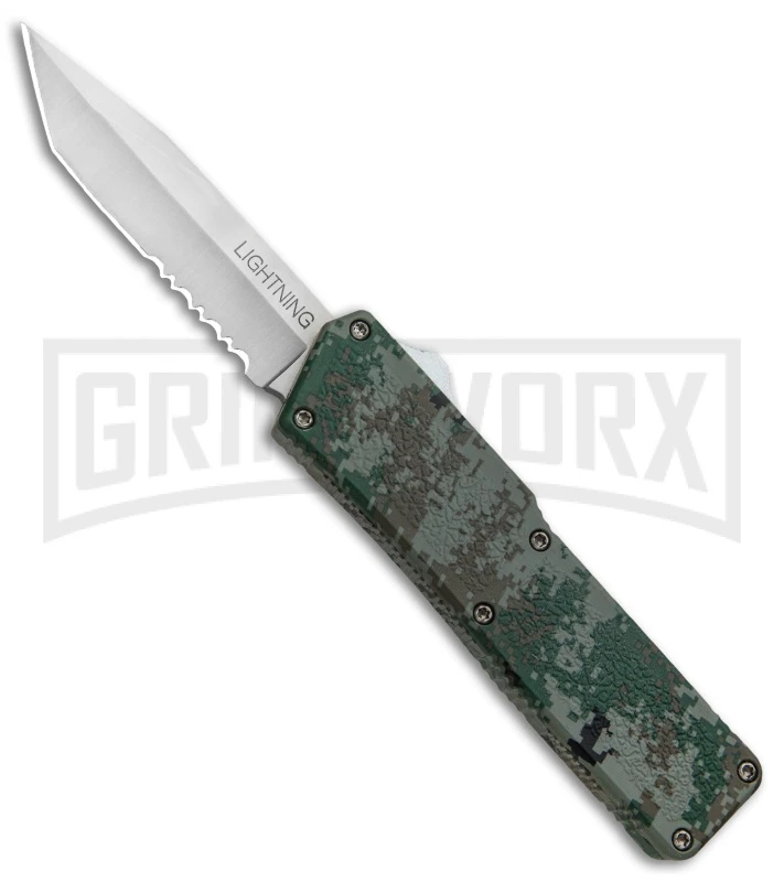This Lightning model is outfitted with a digi-camo handle and a satin finished tanto blade with a partially serrated edge.