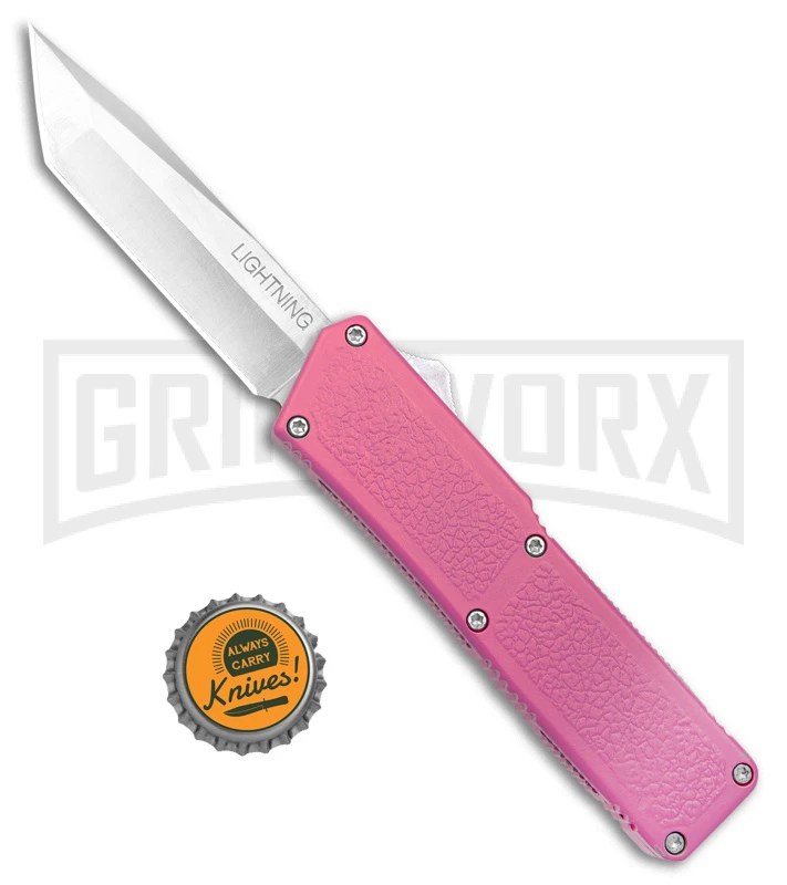 This Lightning OTF model has a pink coated aluminum handle with a textured surface to facilitate good grip. The firing button is mounted on the side, making the Lightning slim and easy to carry. It’s equipped with a stainless steel tanto blade in a satin finish and a plain edge.