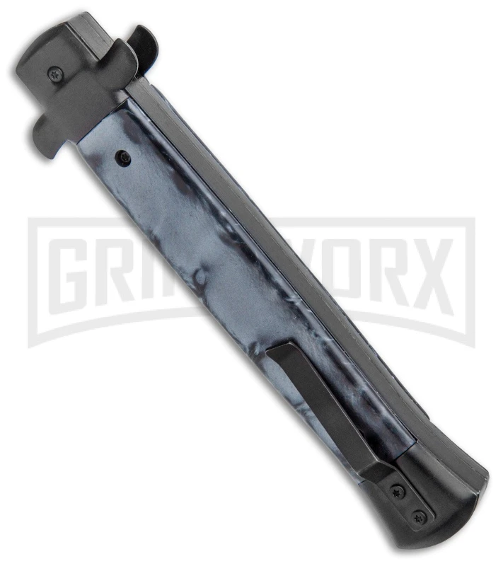 This Mago OTF model features a satin finished dagger blade and black aluminum bolsters and acrylic handle with black smoke designed scales.