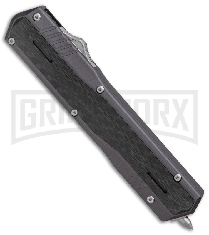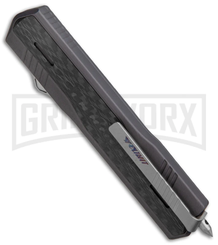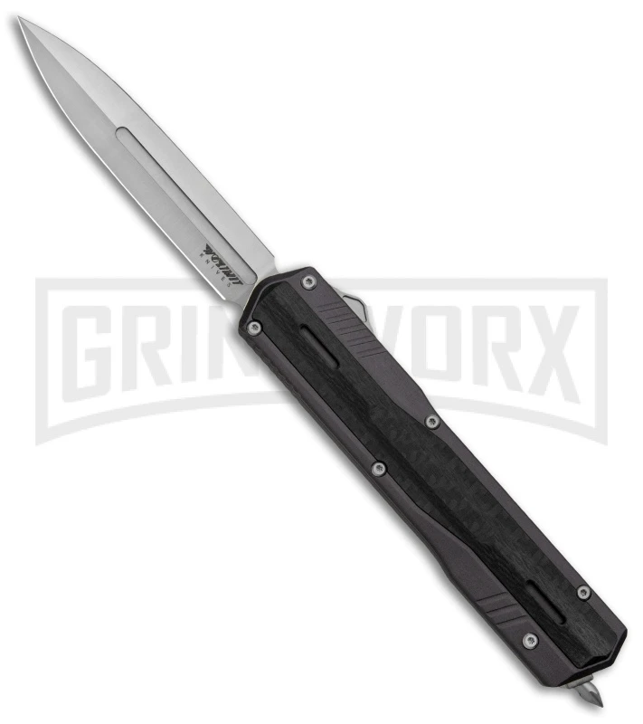 The No Limit Knives Night Stalker is a large, double-action OTF knife with tight lock-up, premium materials, and a killer look and feel. Its double-edged dagger blade is made from CPM-S90V stainless steel, which is known for its remarkable edge retention, and its aluminum handle has attractive carbon fiber overlays. Additional features include a right-side pocket clip and a pointed glass breaker tip. Assembled in the USA!