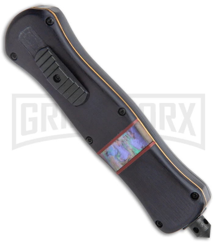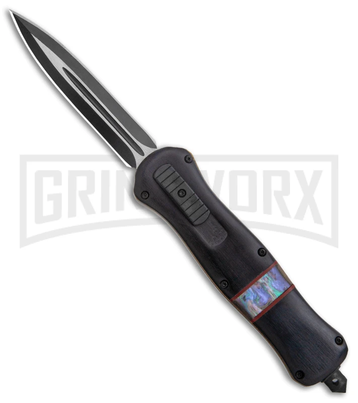This model has a two-tone dagger blade and a wood handle with mother of pearl inlay.