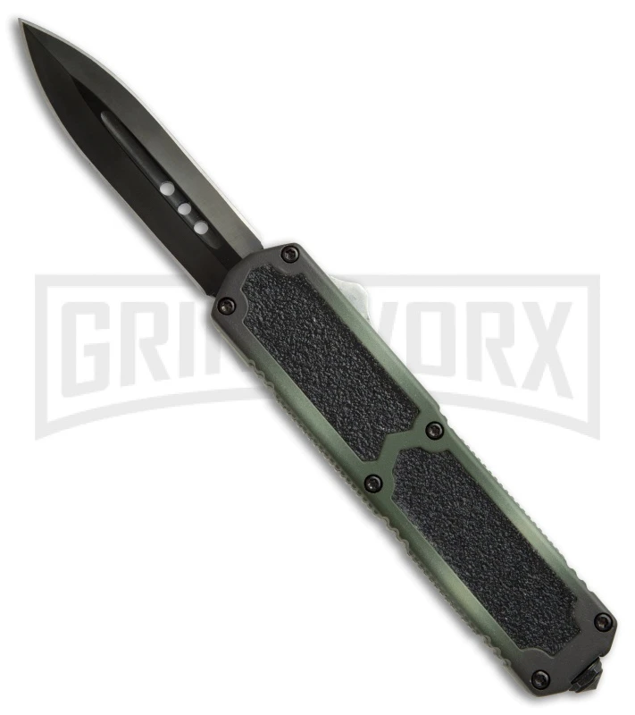 The Titan OTF knife represents a great balance of functionality, usability and value. It has a green camo coated handle with grip inserts, ensuring slip-resistance. The double-edge dagger blade is stainless steel and has a black finish. The firing button is mounted on the side, making the Titan slim and unobtrusive. The pocket clip is mounted on the back and fastened with a glass breaker tip.
