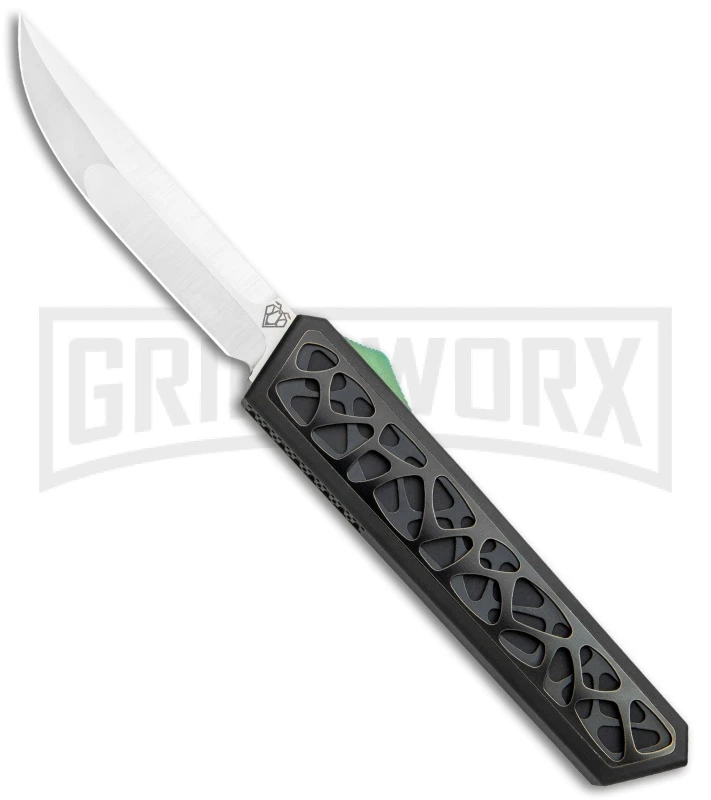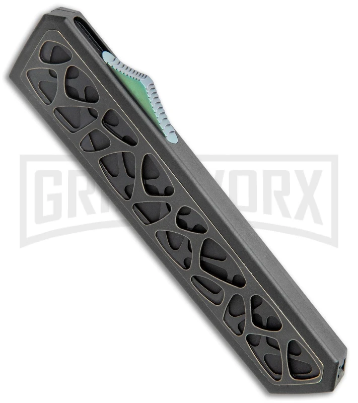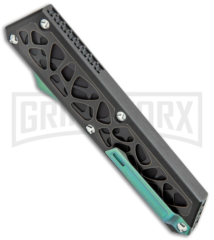 The Vespa Knives Dark Star OTF is a beast of a knife. Far from other fun, but wimpy OTF knives, this bad boy is built with the best materials and tight tolerances. To start, the compound-ground blade is made from Bohler M390 super steel. This steel is capable of holdings its edge far longer than and is far tougher than ordinary stainless knife steels. Next is the remarkable handle: the net-like inlay is titanium, and the thumb slide and pocket clip have been anodized to add that extra flare. The Dark Star OTF is perfect for collectors or those just looking for a workhorse of a knife.