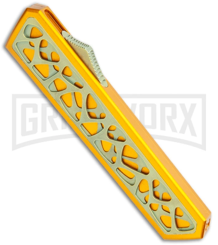 The Vespa Knives Dark Star OTF is a beast of a knife. Far from other fun, but wimpy OTF knives, this bad boy is built with the best materials and tight tolerances. To start, the compound-ground blade is made from Bohler M390 super steel. This steel is capable of holdings its edge far longer than and is far tougher than ordinary stainless knife steels. Next is the remarkable handle: the net-like inlay is titanium, and the thumb slide and pocket clip have been anodized to add that extra flare. The Dark Star OTF is perfect for collectors or those just looking for a workhorse of a knife.